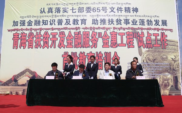 儀式上,黃南州人民政府副州長先巴為活動致辭,中國金融教育發(fā)展基金會理事長初本德和中國人民銀行西寧中心支行行長林建華講話,并向黃南州同仁縣、澤庫縣、尖扎縣和河南縣政府頒發(fā)“金惠工程”教育培訓(xùn)試點(diǎn)匾牌,向黃南州政府捐贈了價值65萬元的扶貧物資。中國金融教育發(fā)展基金會、青海省金融辦、人民銀行西寧中心支行、青海省財政廳有關(guān)領(lǐng)導(dǎo)簽訂了《“金惠工程”合作框架協(xié)議》,中國金融教育發(fā)展基金會專項(xiàng)部、黃南州財政局、人民銀行黃南州中心支行簽訂了《在黃南州開展“金惠工程”教育培訓(xùn)(試點(diǎn))合作備忘錄》,金融機(jī)構(gòu)與貸款戶代表現(xiàn)場簽訂了大學(xué)生創(chuàng)業(yè)貸款、婦女創(chuàng)業(yè)貸款、新型農(nóng)村經(jīng)濟(jì)組織扶貧貸款、農(nóng)戶扶貧貸款合同。