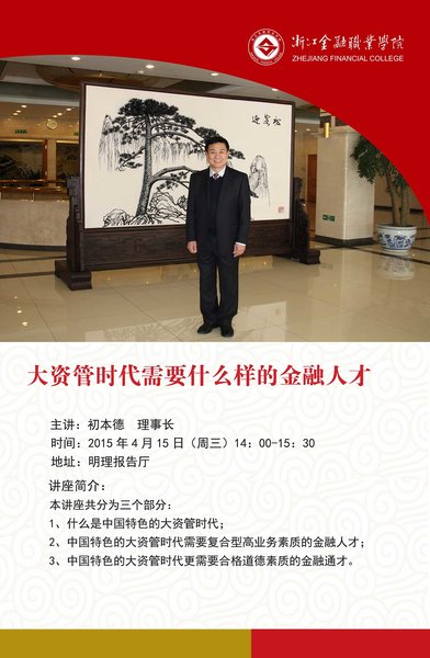 大資管時代需要什么樣的金融人才,高校如何培養(yǎng)造就具有合格道德素質的金融通才? 4月15日,在浙江金融職業(yè)學院舉行的專題報告會上,中國金融教育發(fā)展基金會理事長初本德就這兩個問題給出了答案。報告會由浙江省金融教育基金會秘書長、浙江金融職業(yè)學院副院長吳勝主持。