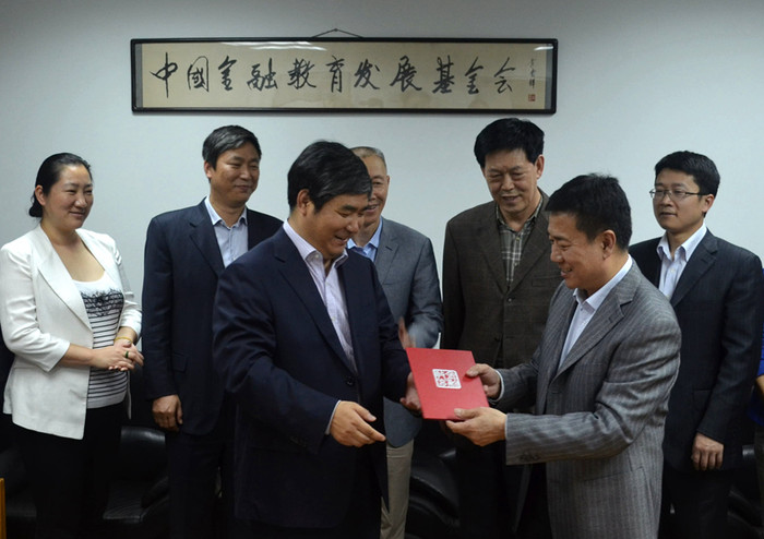 漢唐教育集團(tuán)董事長張曉彬接受中國金融教育發(fā)展基金會理事長初本德贈予捐贈證書