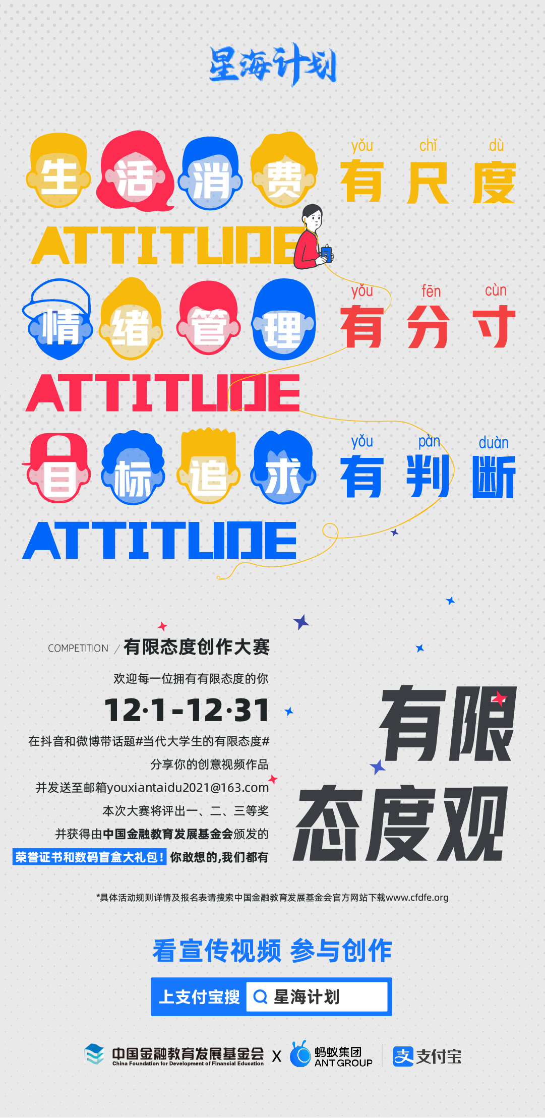 為精準開展金融知識宣教工作,幫助高校青年群體樹立正確的消費觀念,中國金融教育發(fā)展基金會聯(lián)合螞蟻集團定于2021年12月開展“星海計劃——有限態(tài)度創(chuàng)意作品征集大賽”活動。具體內(nèi)容如下:
